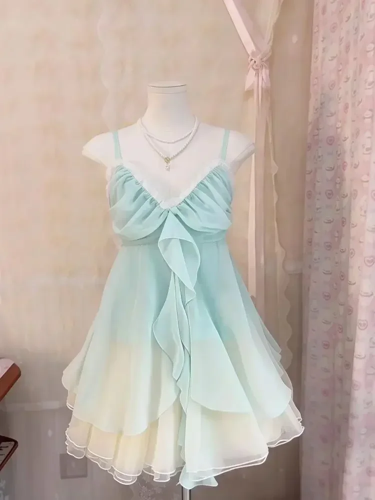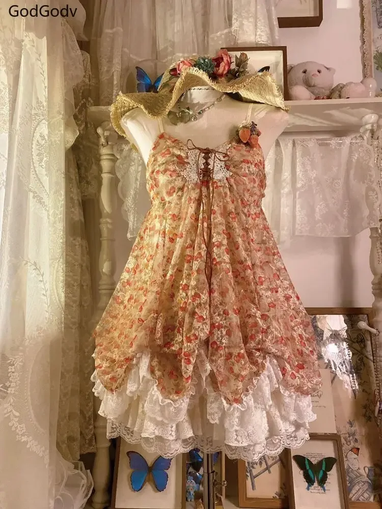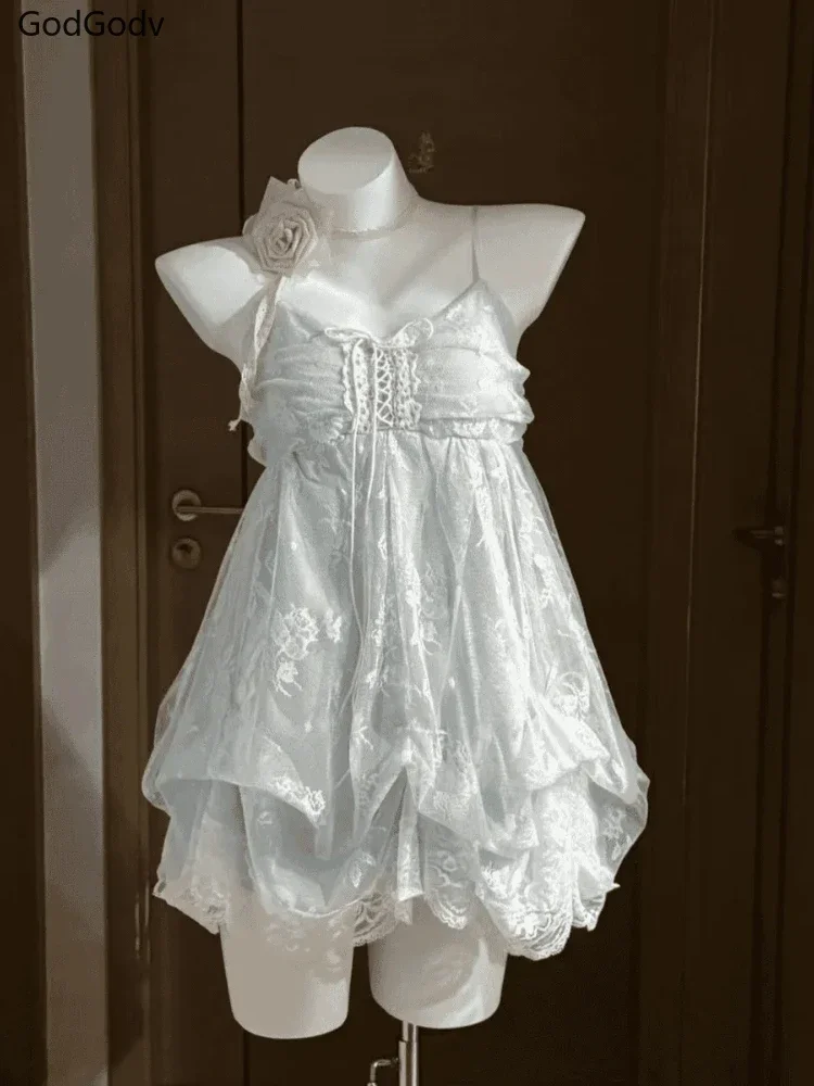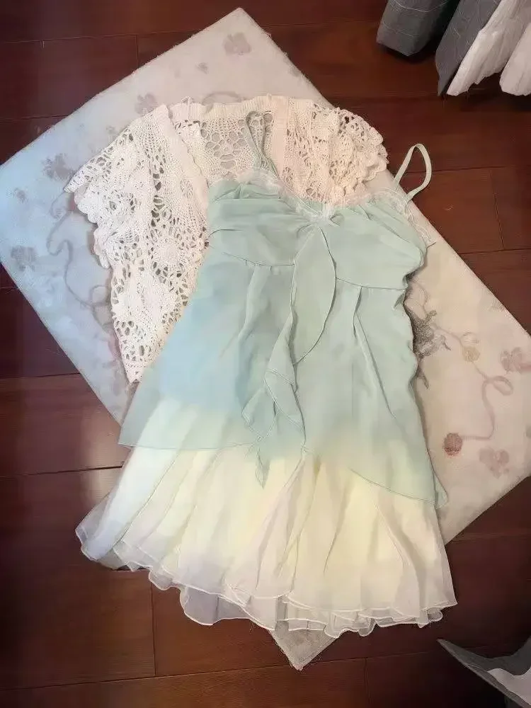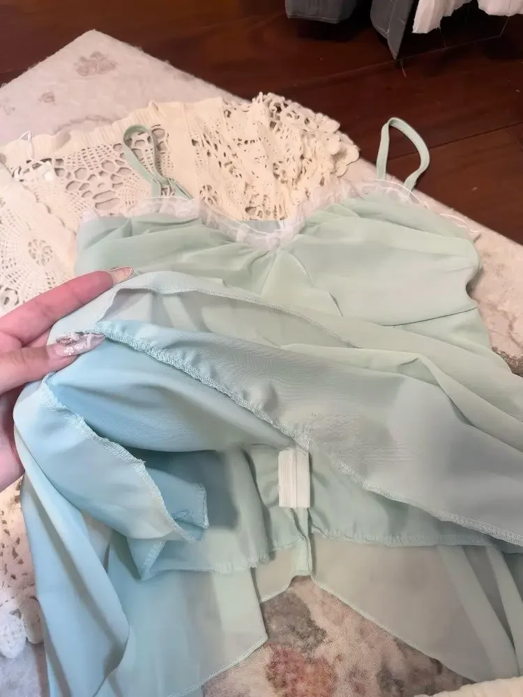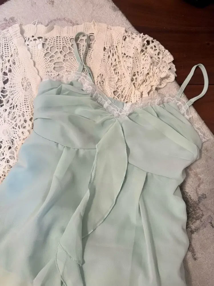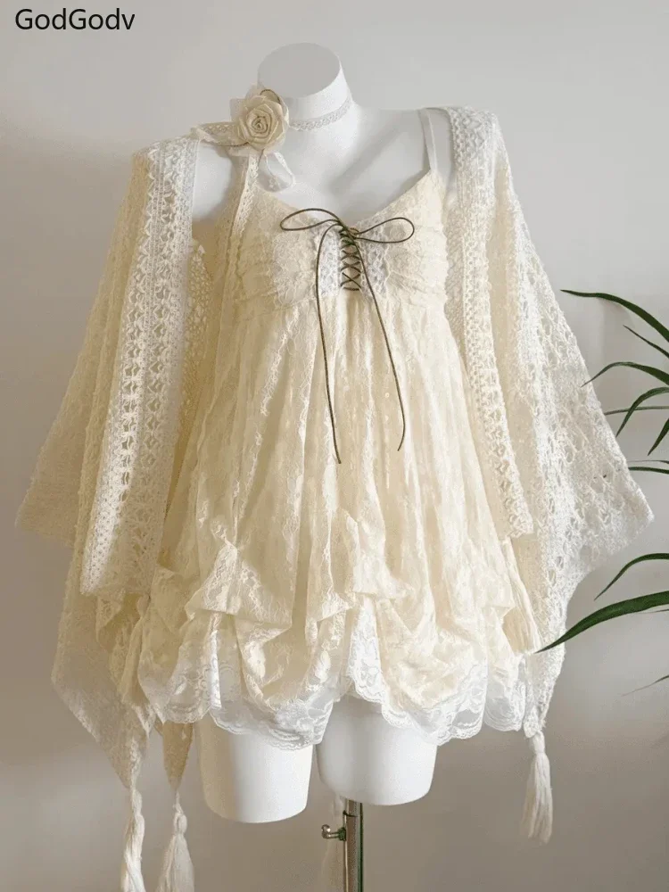 New Vintage Summer Women Sets Elegant Ruffle Lace Chiffon Design Mini Skirt Suit Fairy Female Sweet Korean Fashion Outfits 2025