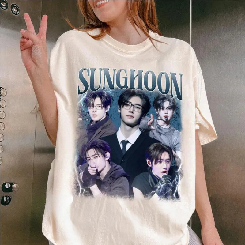 Sunghon Kpop Pattern Printed T-shirt for Women, Korean Style Top, Spring/Summer Pure Cotton Unisex Short Sleeve T-shirt